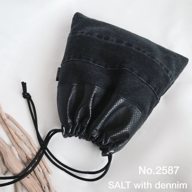 BlackDenim×Leatherのフラット巾着です。
