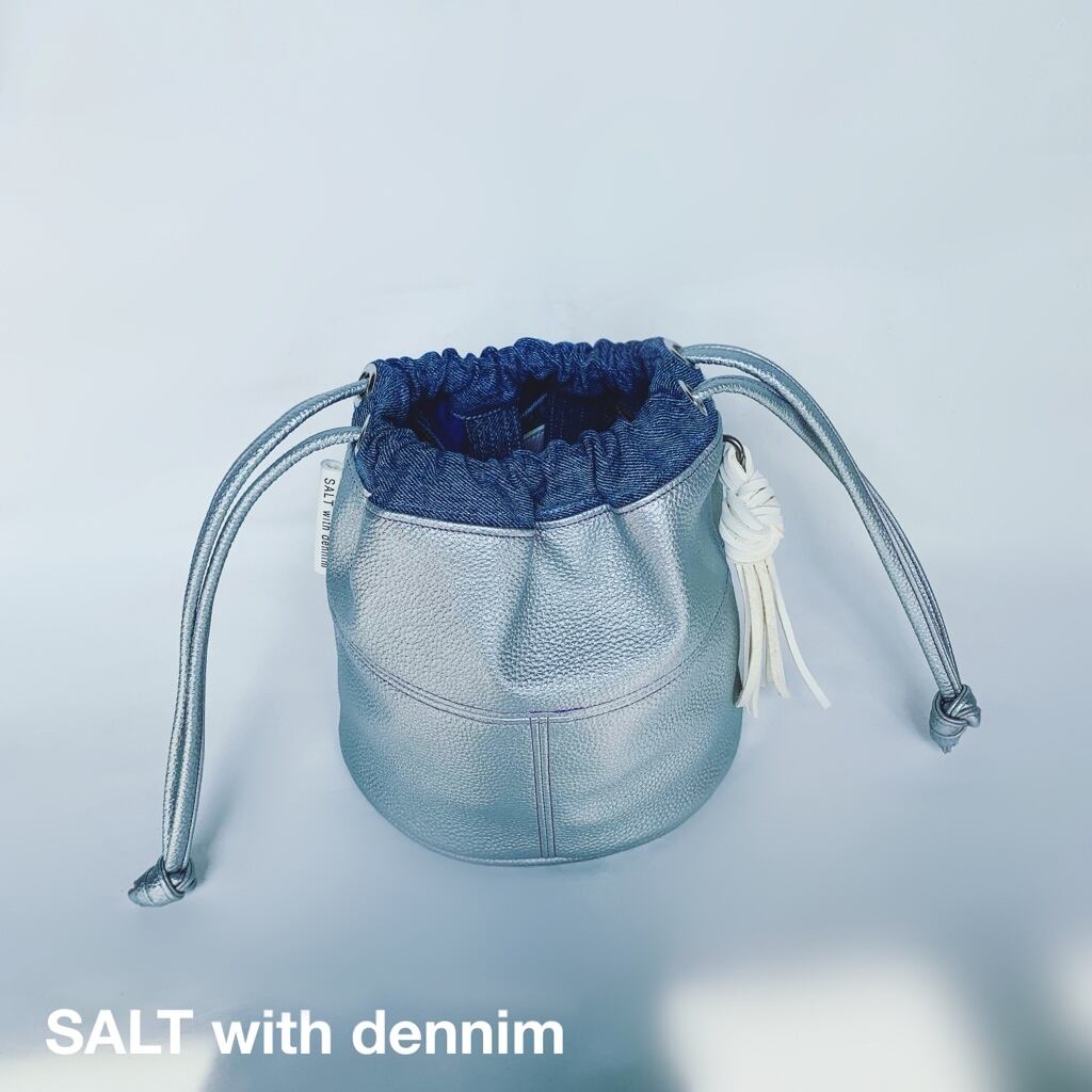 爽やかでかわいいシルバーのソフトレザー調生地にデニムを合わせた巾着トートバッグです。